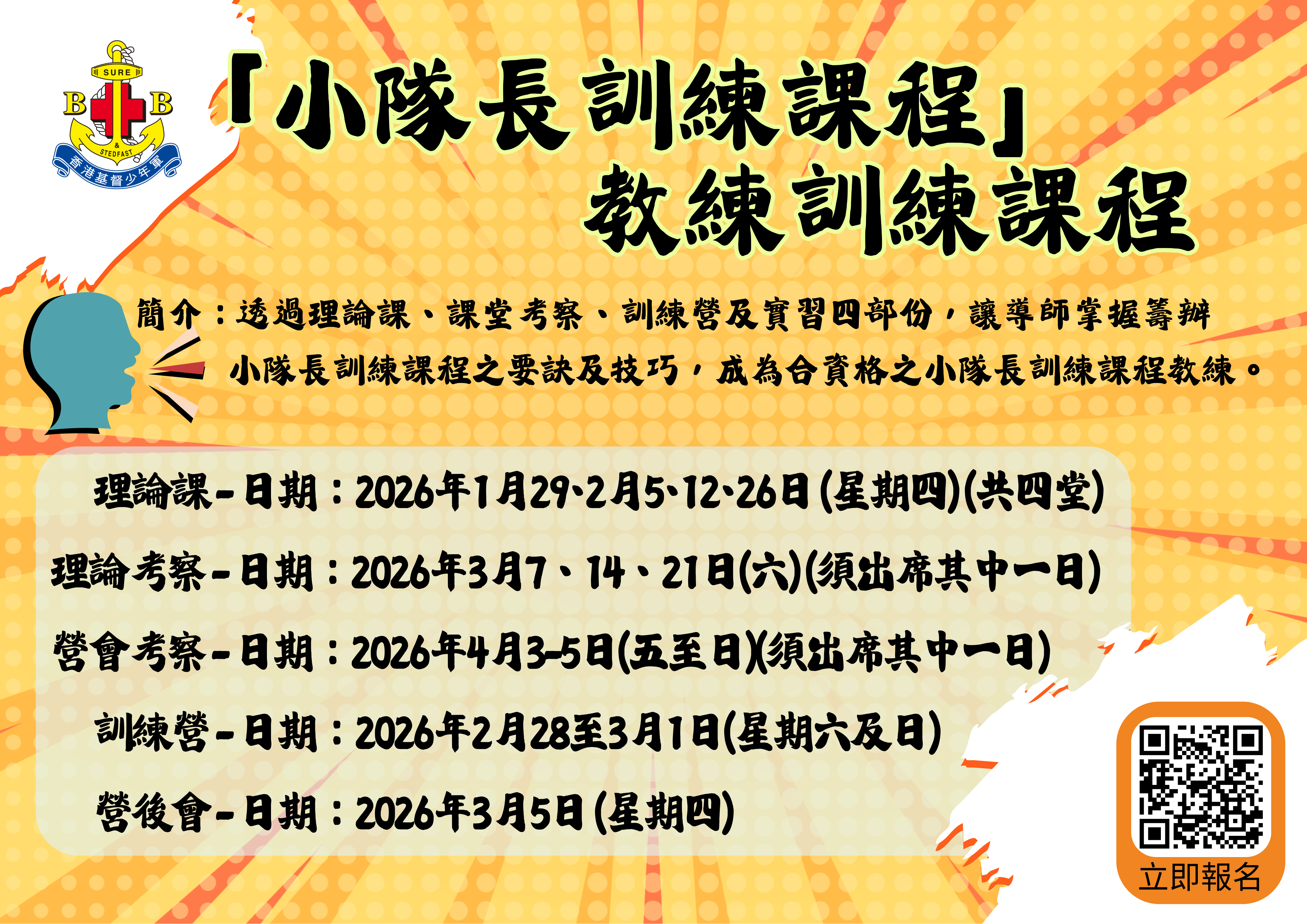 2026年暑期總部舉辦之基本小隊長訓練課程,詳情可參閱中級組小隊長訓練網頁