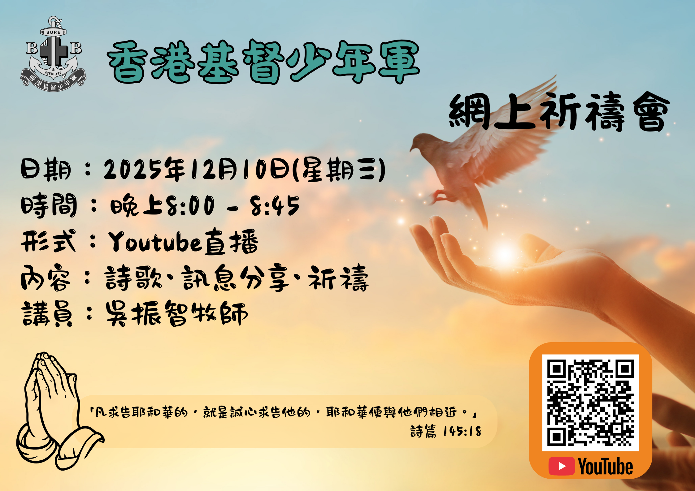 線上祈禱會詳情如下: 日期:2025年12月10日(星期三) 時間:晚上8:00 - 8:45 形式:網上祈禱會 (按此) 內容:詩歌﹑訊息分享﹑祈禱 訊息分享(本會會牧吳振智牧師);領禱(執委會主席方煒鍵先生﹑副主席盧永靖先生及總幹事吳淑玲女士) 查詢︰制服團隊部同工 2273-0319