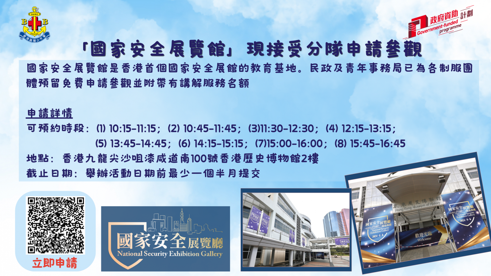 國家安全展覽館是香港特別行政區首個致力於系統推廣國家安全教育的專題展覽館,也是香港首個國家安全展館的教育基地。民政及青年事務局已為各制服團體預留免費申請參觀並附帶有講解服務名額,詳請如下: