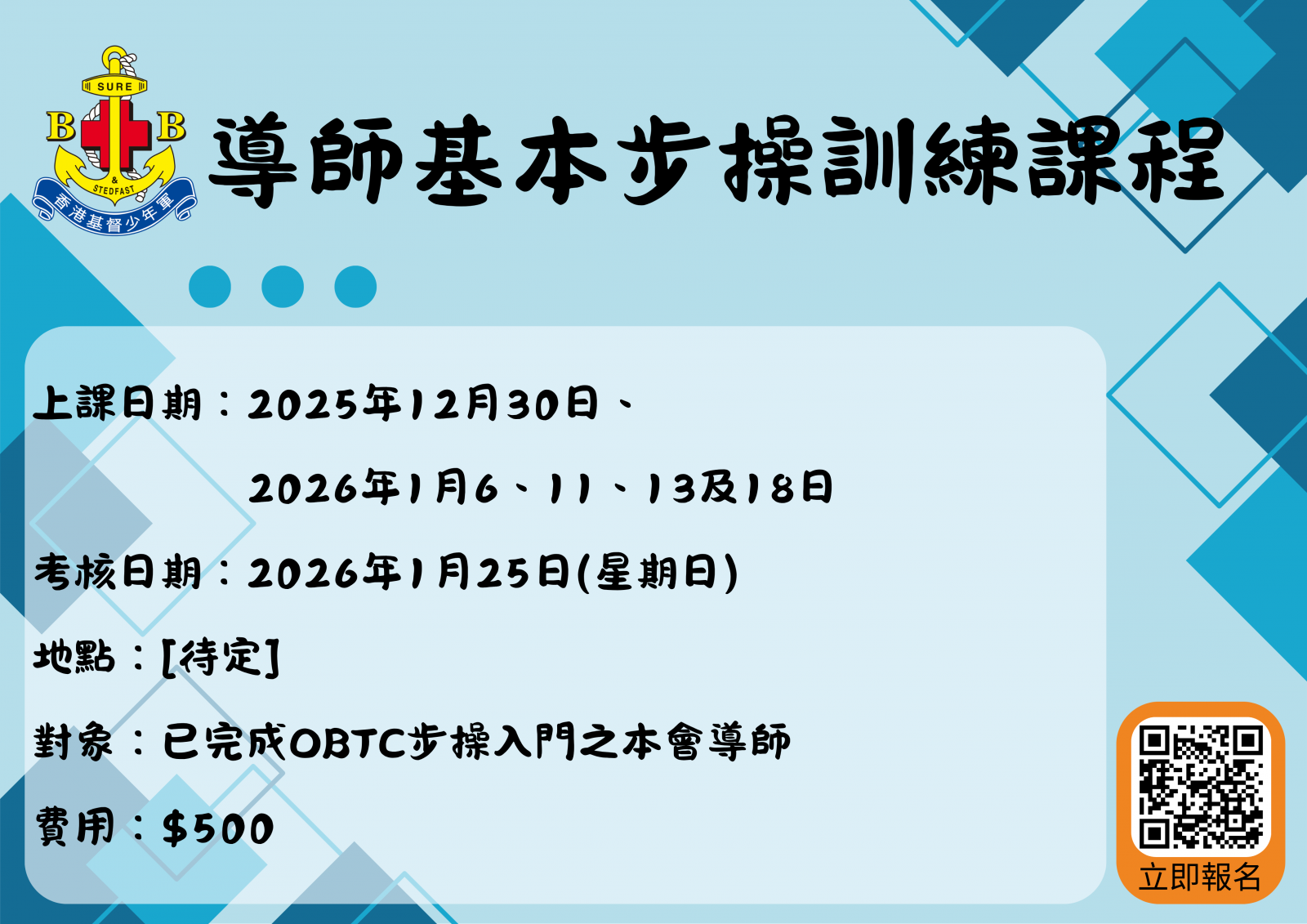 2. 持步操章一級或已完成十架章步操訓練、並正在修讀/已完成導師基本訓練課程的導師,可豁免修讀此課程,但必須參加最後一堂考核,合格者才可獲頒相關證書;不合格者可於下一期的課程再次參加考核或報讀基本步操訓練課程。手續如下: