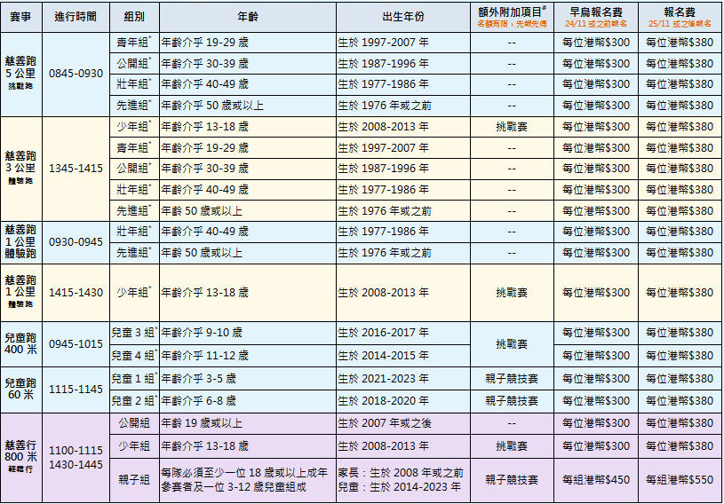 親子競技賽及挑戰賽是為兒童組、少年組及親子組的參加者而設,安排如下: