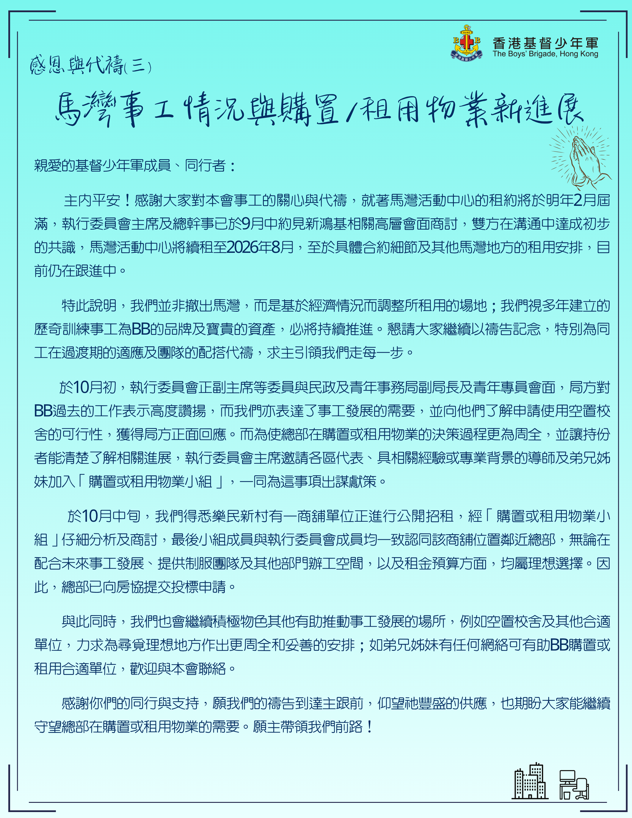 感恩與代禱(三) 馬灣事工情況與購置/租用物業新進展