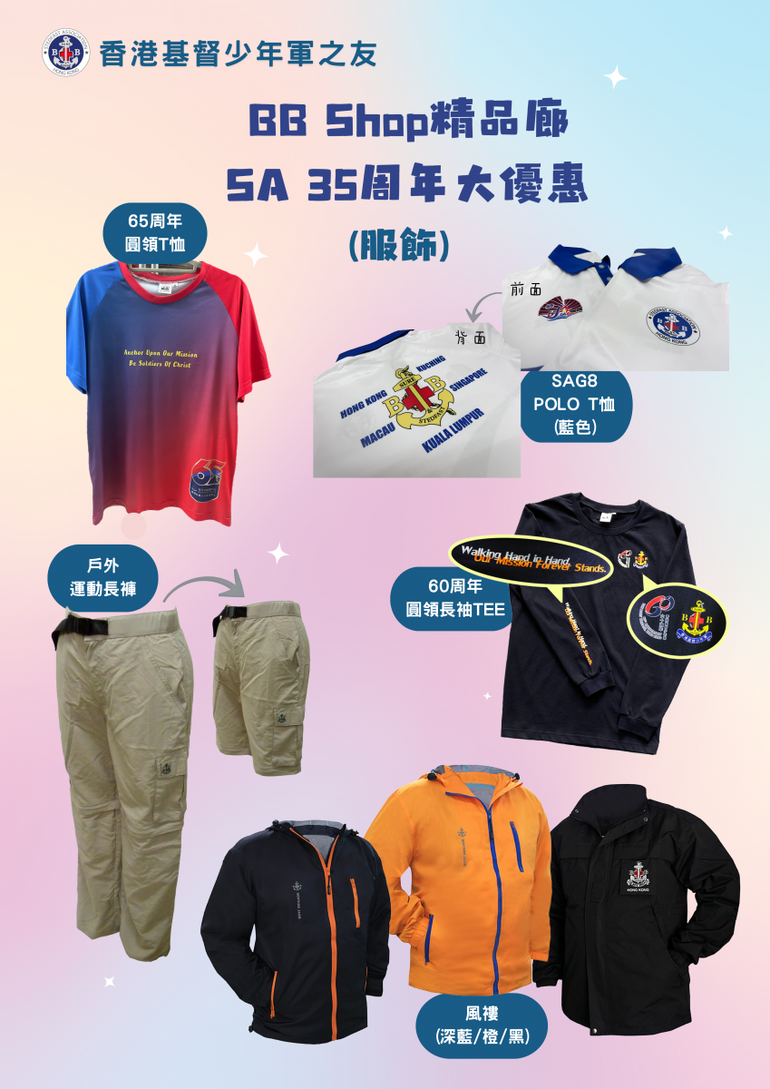為慶祝香港基督少年軍之友成立35周年,由即日起,凡購買BB Shop指定紀念品及服飾,均可享有半價優惠(個別特價品更享有折上折優惠),貨品數量有限,勿失良機,請快快選購心水禮品自用或送給隊員啦!