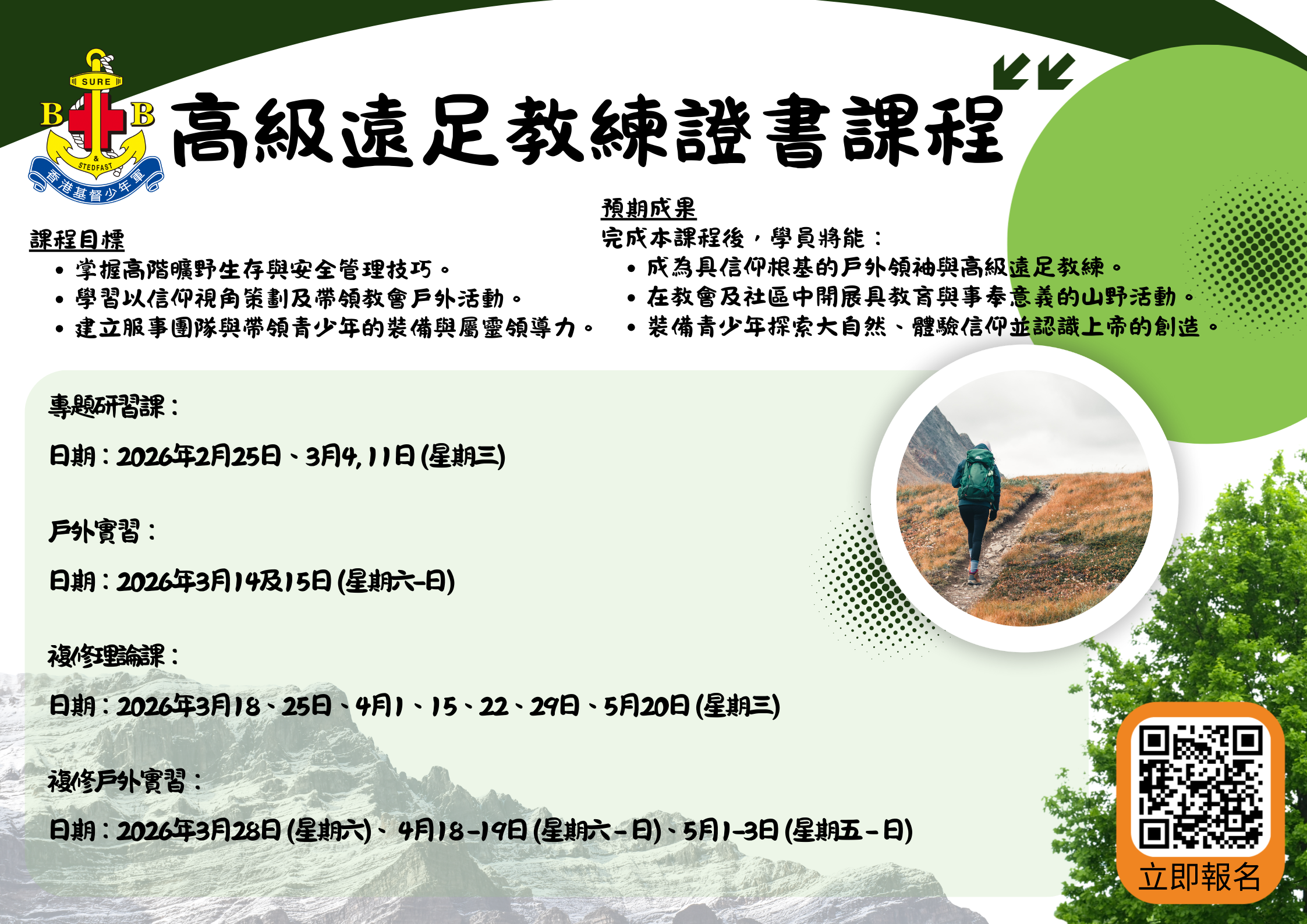 • 成為具信仰根基的戶外領袖與高級遠足教練。