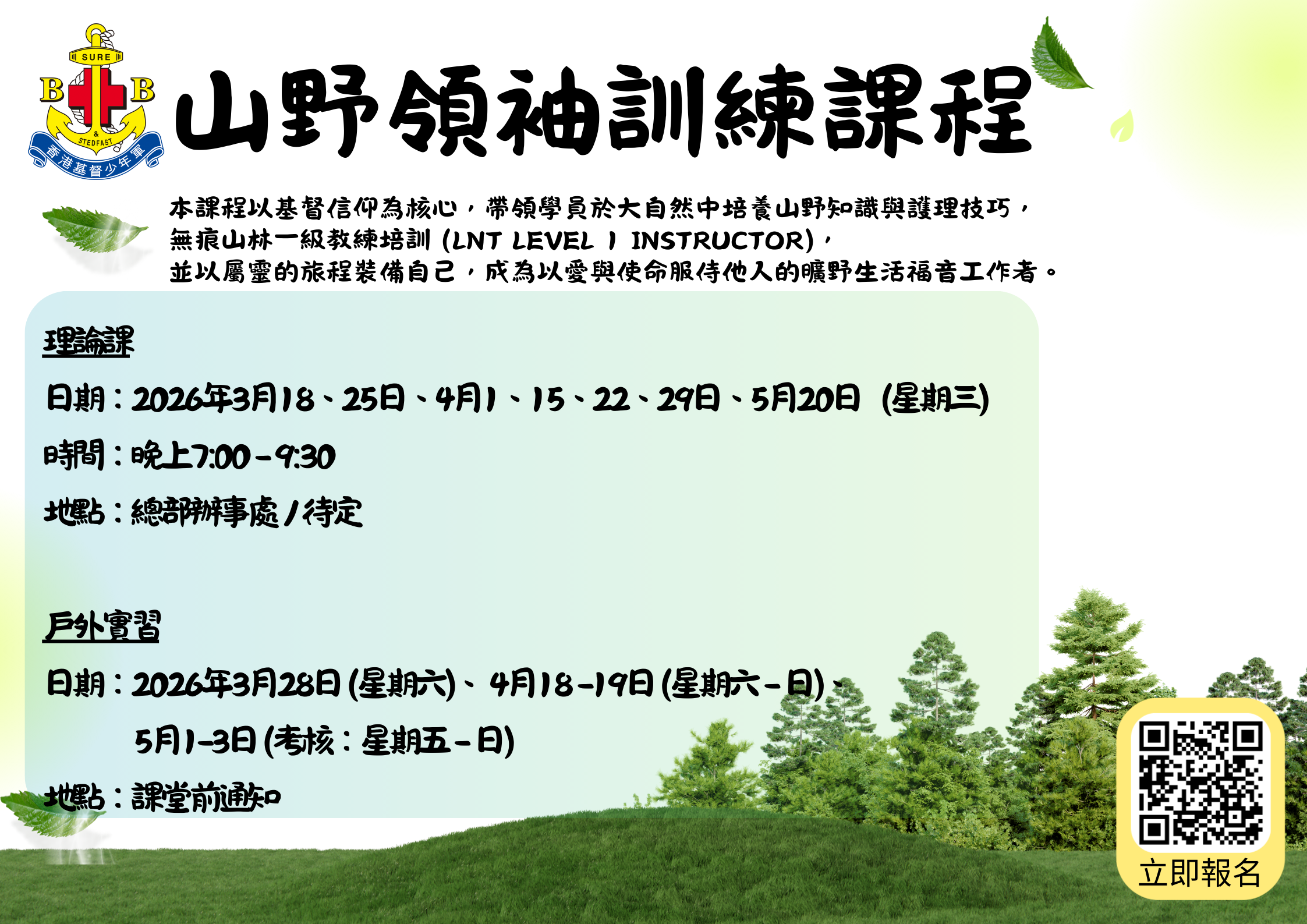 戶外實習日期:2026年3月 28日(星期六)、 4月18 -19日(星期六 - 日)、5月1-3日(考核:星期五 - 日)