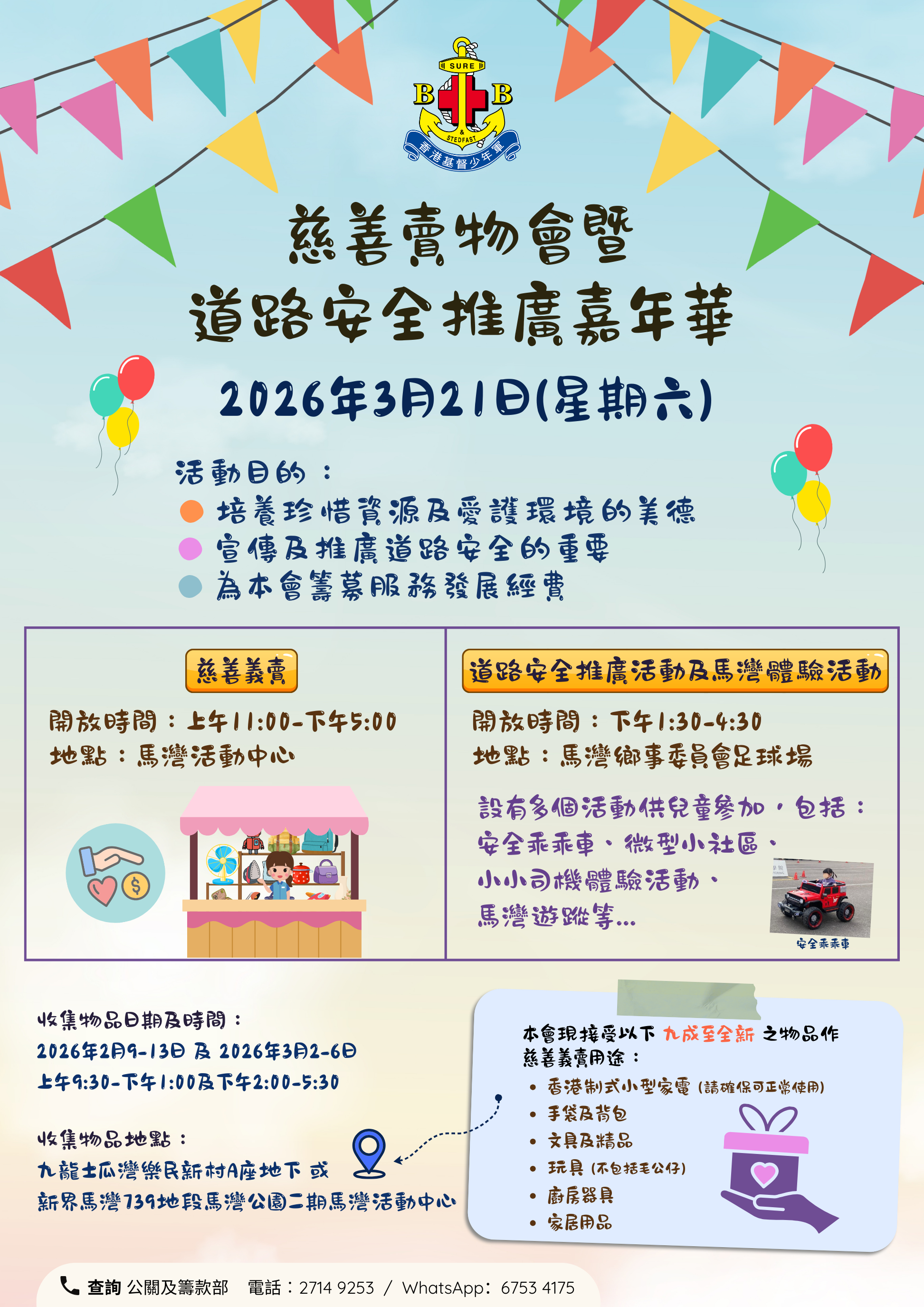 本會將於 📆2026年3月21日(星期六)舉辦「慈善賣物會暨道路安全推廣嘉年華」🥰,誠邀分隊導師、隊員及家長透過不同方式支持及參與這個有意義的活動🥳。