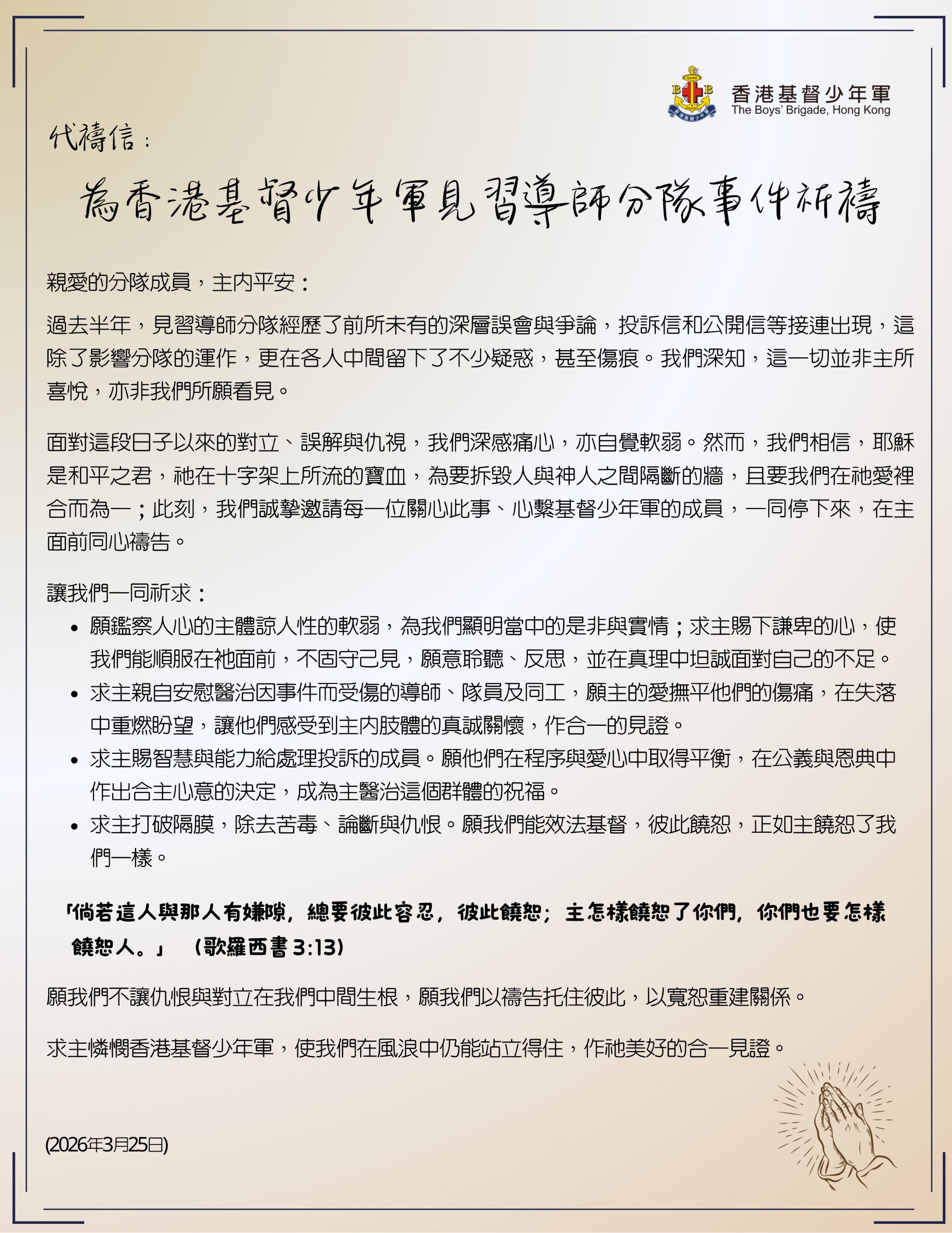 代禱信:為香港基督少年軍見習導師分隊事件祈禱