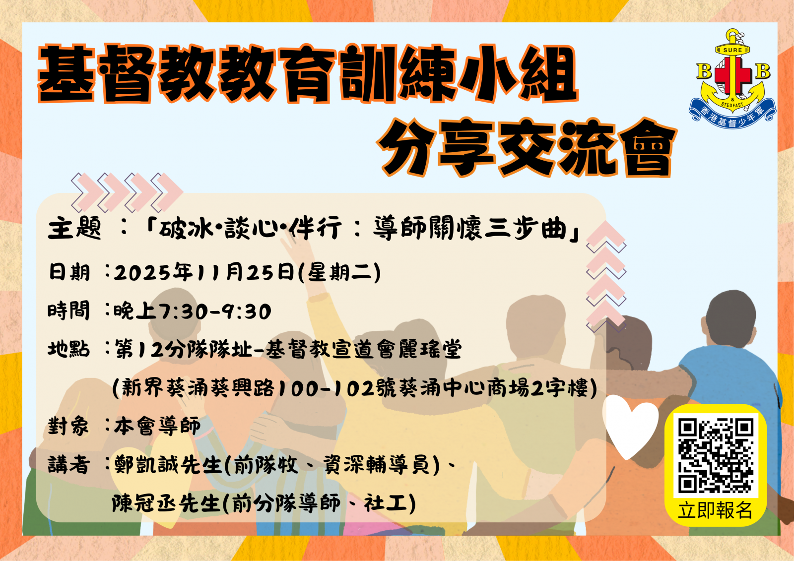 內容︰透過牧者及社工的經驗分享,學習怎樣關心隊員們的精神健康,與隊員打開話題及回應他們的需要。