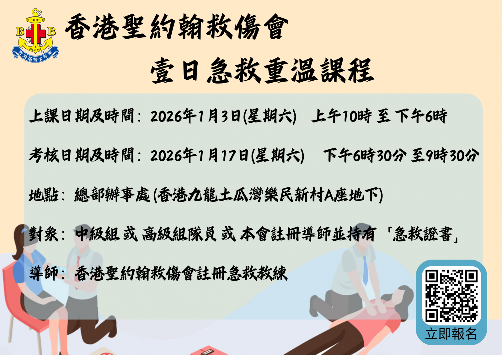 對象: 中級組隊員 或 高級組隊員 或 本會註冊導師 並 持有「急救證書」*註1