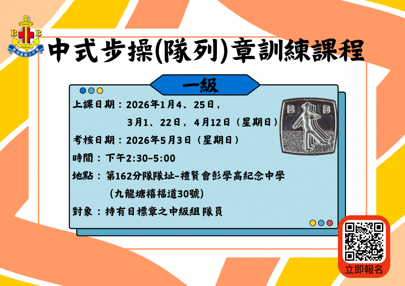 日期:2026年1月4、25日,3月1、22日, 4月12日 (星期日 ,共5堂) 地點:第162分隊隊址-禮賢會彭學高紀念中學(地址:九龍塘禧福道30號) |