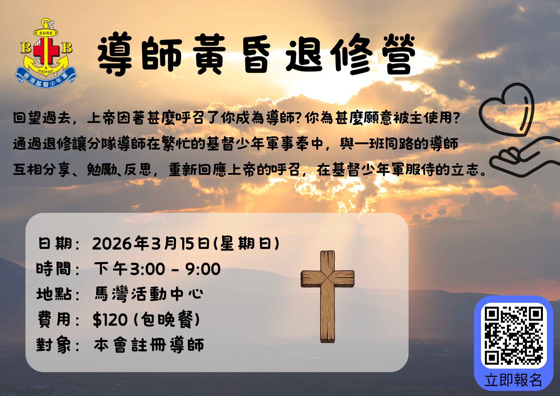 內容:通過退修讓分隊導師在繁忙的基督少年軍事奉中,與一班同路的導師互相分享、勉勵﹑反思,重新回應上帝的呼召,在基督少年軍服侍的立志。