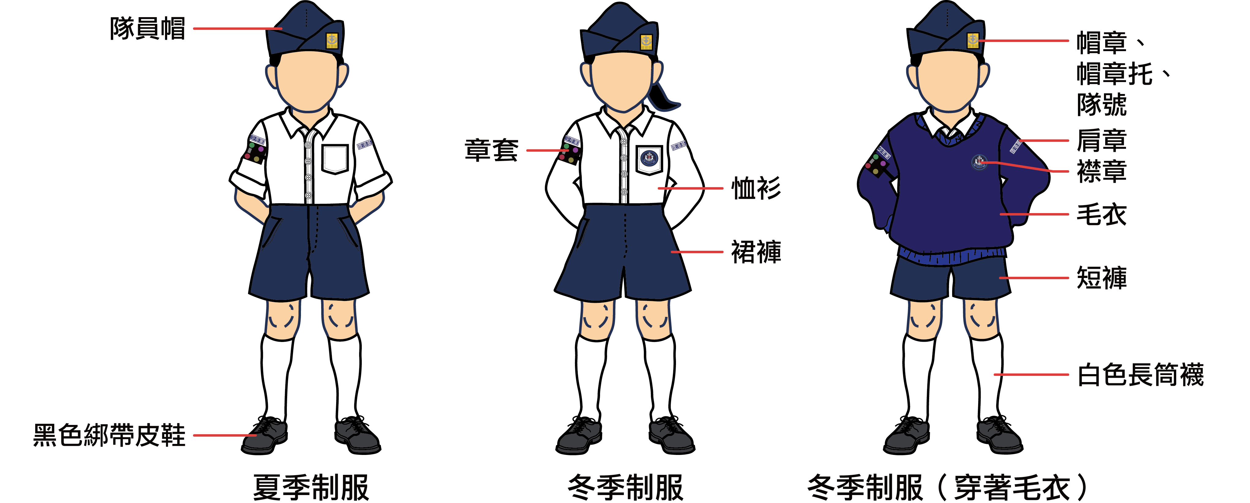 男隊員:深藍⾊⻄裝短褲 女隊員:深藍⾊⻄裝裙褲 |
